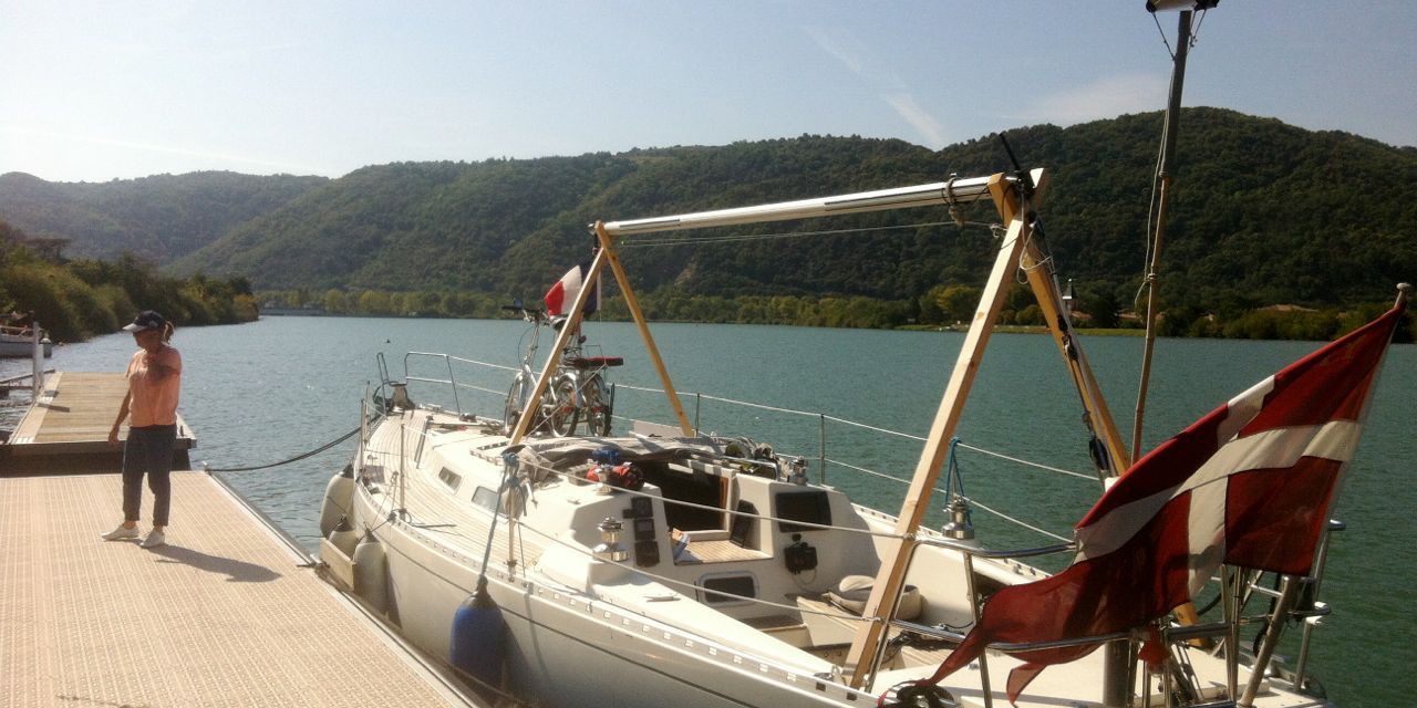 I en lille sidegren til Rhone var der sejlbåde – med mast og sejl på! OK, små joller med kahyt, men det lugter da lidt af noget, som vi har savnet længe, at sejle for sejl. Sejlklubbens præsident gennem 10 år tog imod os på pontonen, jo der manglede ikke noget (andet end el og vand!)