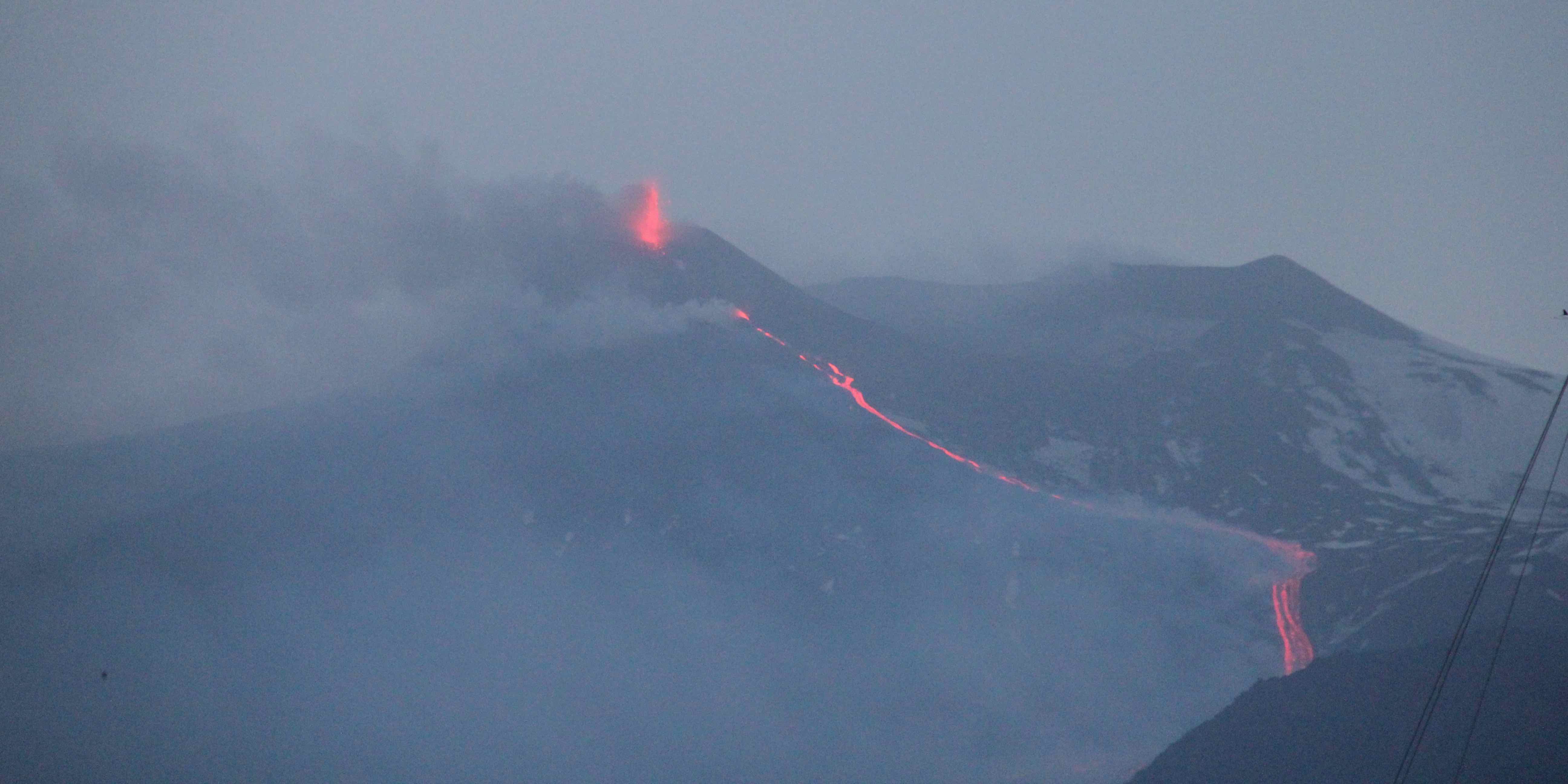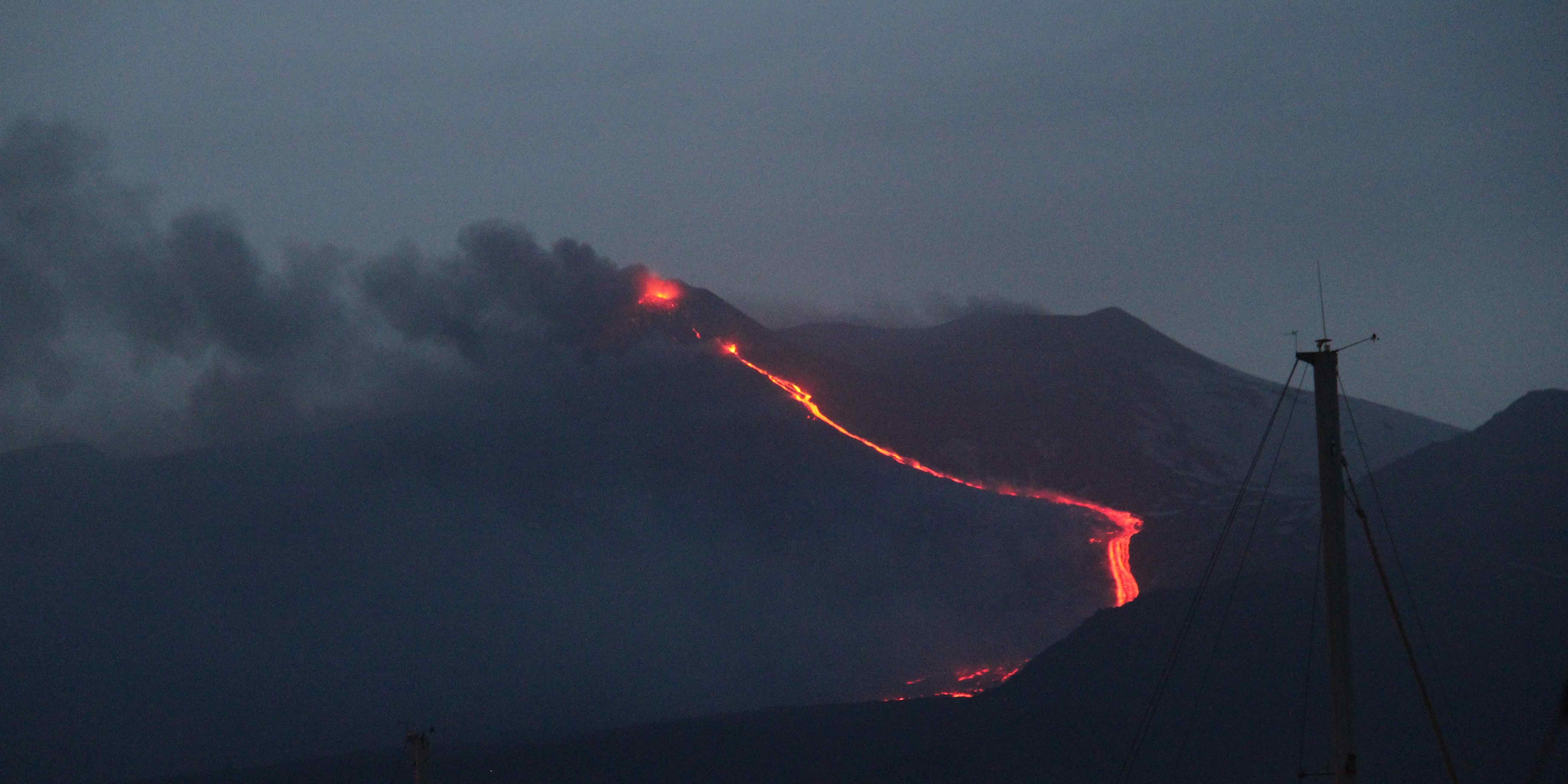 Klokken er godt 22, vi sidder i cockpittet i shorts og t-shirts. OG det buldrer og brager i baggrunden. Ned ad Etnas skråning løber en bred 4-sporet motorvej af glødende lava, på toppen sendes kaskader af glødende sten op i luften, det er det, der larmer
