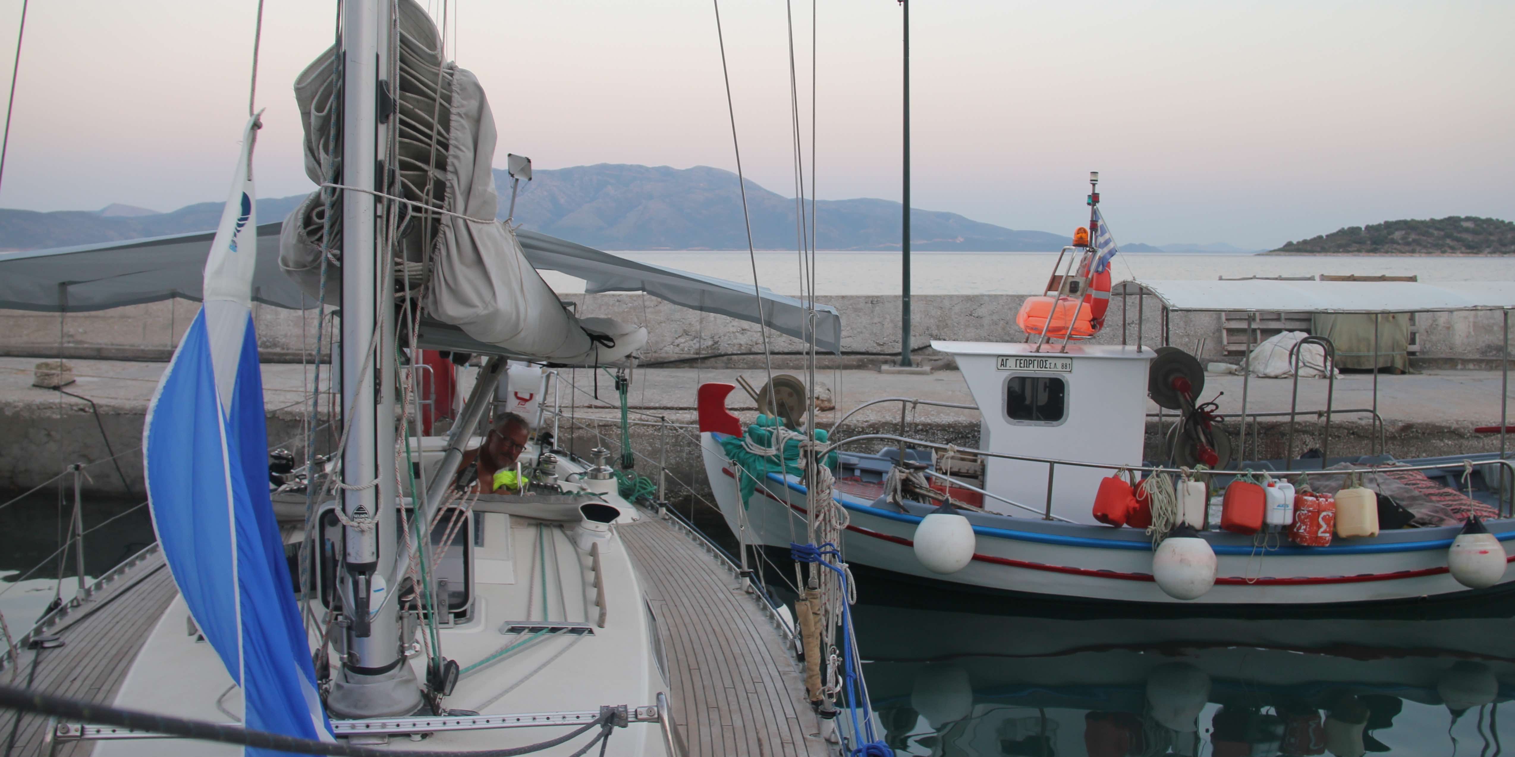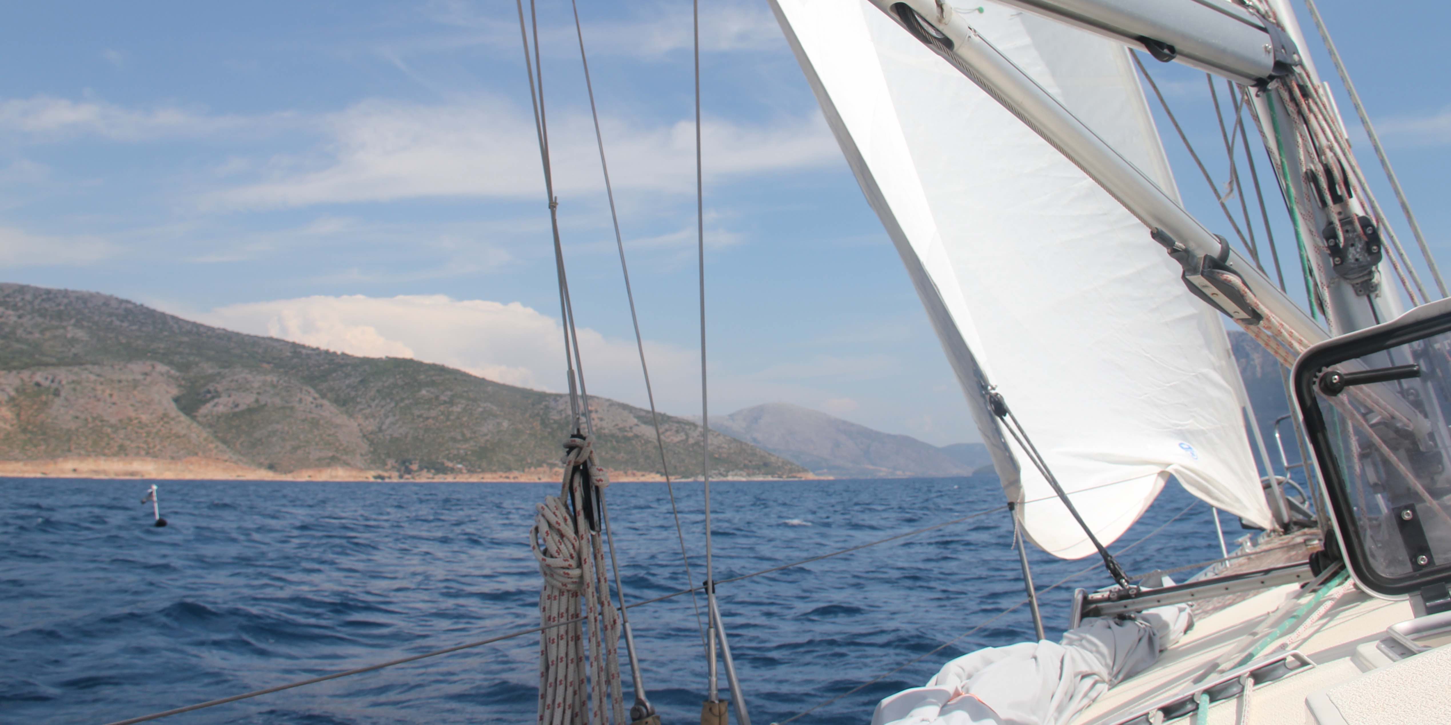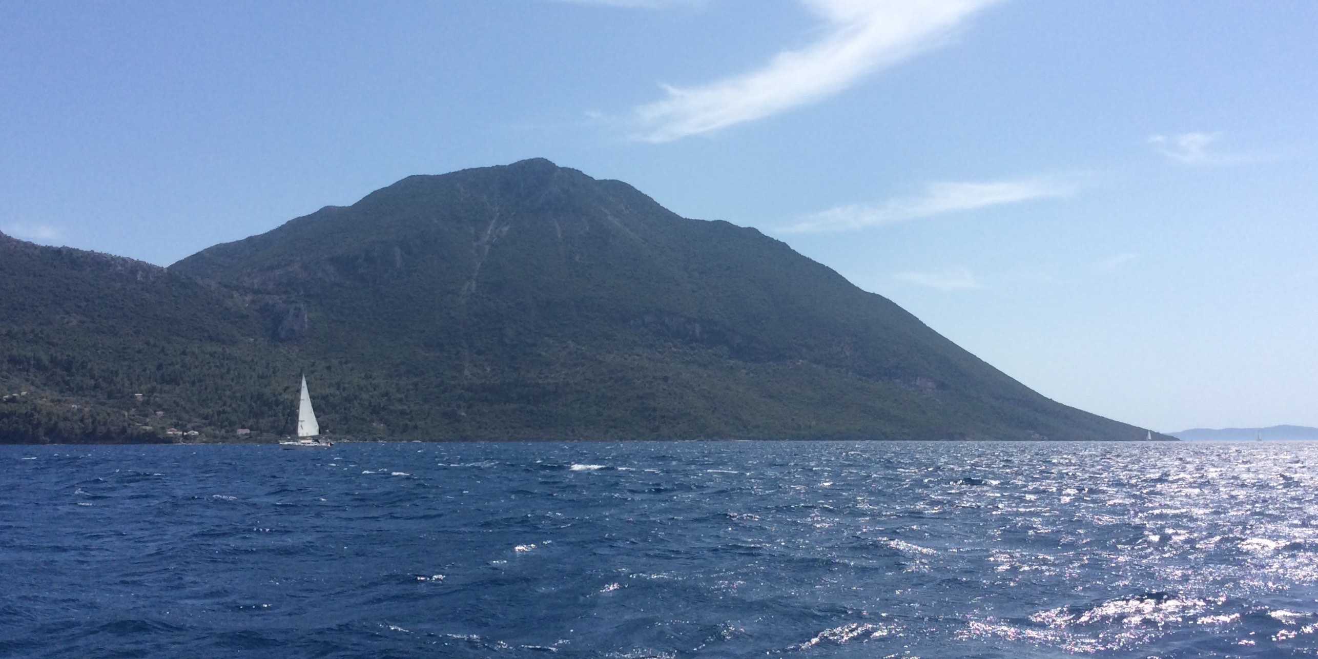 For sydgående efter kanalsejlads ved Lefkas fik vi den herligste halvvind, satte alle sejl for første gang i sommer, og gled af sted gennem det smukke ølandskab mellem Kefalonien, Lefkas, Ithaka, Kalamos og hvad de smukke, grønne, bjergrige øer nu alle sammen hedder.