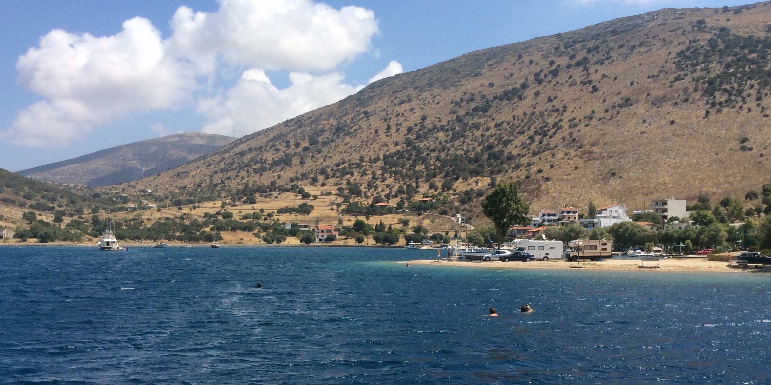 Byen har få forretninger, men nok 20 tavernaer og barer. Her omkring havnen er der 8-10 af dem, og de er alle fyldt med spisende grækere kl. 21.30. Havnepromenaden er fyldt med unge mennesker, der hygger sig (uden alkoholiske drikke!), drengene lægger arm og pigerne fniser og står her tæt på båden og sætter håret.
