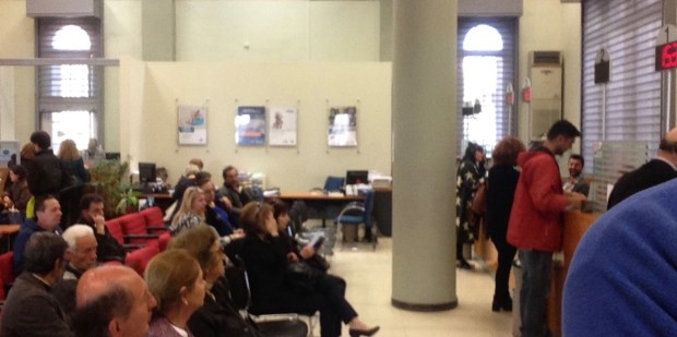 I juli 2015 var der lange køer uden for bankerne for at få lov til at hæve de daglige 50€ af egne, opsparede penge. Nu er køerne rykket inden for i banken, og der er opsat lænestole i rækker. Vi skulle betale vores 50€ “skat” for at sejle i det græske, nyt DKPA-bevis.
