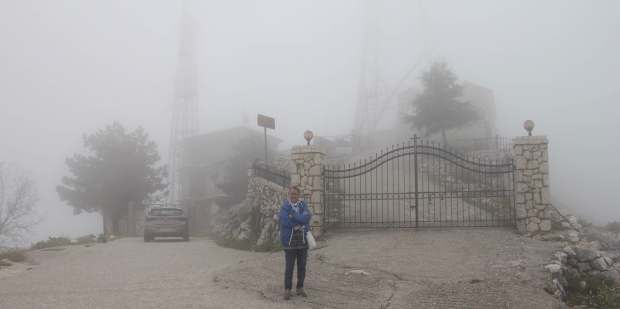 Open Skirons vejrmelding for de kommende dage. Vi ligger nede i det højre hjørne og skal op mod det modsatte hjørne. Symbolerne betyder modvind 10 – 17 m/s!På en køretur rundt på Korfu (inden vi sagde helt farvel til Grækenland) skulle vi naturligvis op og nyde udsigten fra øens højeste punkt. “Flot ikke!” med armene over kors.