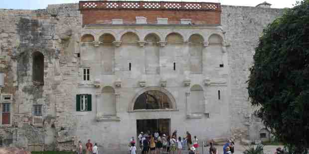 Diocletian var den første romerske kejser, der gik på pension, de fyrre forgående havde alle forladt embedet ufrivilligt, myrdet, forgiftet o.s.v. Diocletian rejste som “pensionist” til sin hjemegn og opførte paladset på ca. 500m x 500m, der tjente som pensionistbolig de sidste ti år af hans 80 årige liv. Her Østporten til paladset. Nicherne øverst er til de to romerske kejsere, ham selv for øst og kollegaen for vest Maximian Herculius, og nedenunder er der nicher til deres udpegede medregenter Constantius og Galerius, men de er for længst fjernet.Genbrug: Paladset søjler er delvist stjålet i Egypten, og den mørke løve til højre er simpelt hen en sfinx i nye omgivelser.Mønstre fra Indien, svastikakorset, side om side med keltisk mønster. Romerrige bredte sig vidt omkring, Diocletian regerede den østlige del.Airbnb i Split hos en ældre lærerinde.