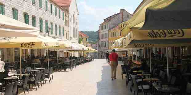 På bilture ind i landet kører vi ofte til tilfældige steder ad tilfældige ruter, væk fra turistguidernes anbefalinger. Her hovedgaden i Sinj, 50 km fra “turist-bræmmen”. Her er helt stille!