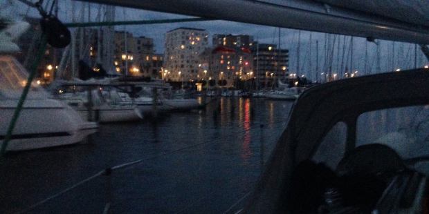 Mørket var faldet på, da “Bare Lykke” med Steen, Per og Jens anduvede Aarhus Lystbådehavn i lidt småregn 8. august.